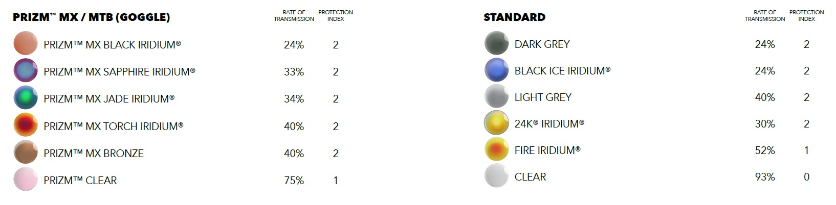 Prizm ™ to rewolucja w optyce soczewki zbudowanej na podstawie dziesięcioleci badań nad kolorami. Soczewki Prizm ™ zapewniają bezprecedensową kontrolę nad transmisją światła, co powoduje precyzyjne dopasowanie kolorów, po to, aby zmaksymalizować kontrast i zwiększyć widoczność.