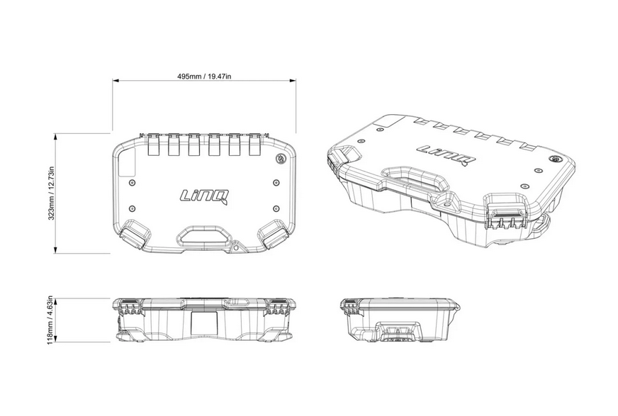Można układać w stos z dodatkową skrzynią modułową LinQ (715005494, 715007112) lub wodoporną torbą LinQ 40l (715008110) dla rozszerzonego miejsca do przechowywania. Wymaga uchwytów LinQ do piętrowania akcesoriów (295101009) do układania pudeł lub torby.